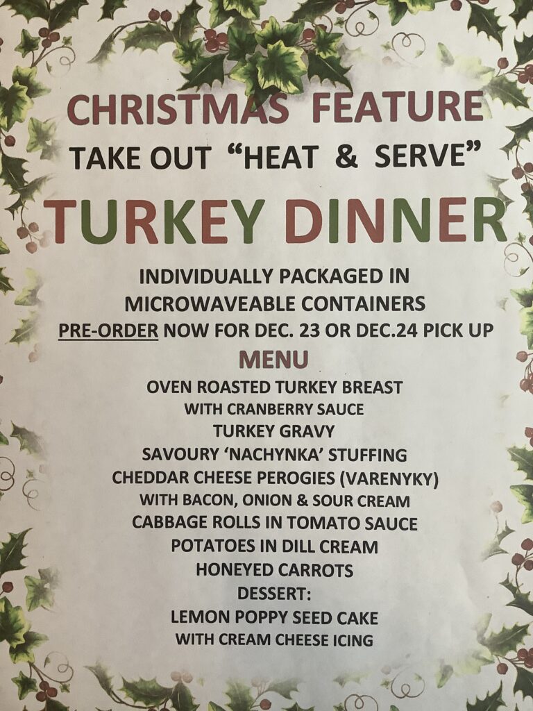 CONSIDER OUR FEATURE FULL CHRISTMAS TURKEY DINNER 'HEAT & SERVE' TAKE AWAY ~ OVEN READY IN CONVENIENT MICROWAVEABLE CONTAINERS PRE ORDER FOR DEC. 23 OR 24 PICK UP